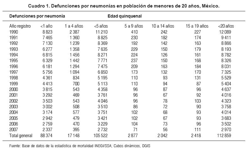 La disminución de las defunciones por neumonías durante el período 1 990-2007 se registra en forma drástica entre los menores de cinco años, con una reducción de 75%, siendo incluso un poco mayor en el grupo de 1 a 4 años (cerca de 84%). Globalmente, el número de muertes en menores de cinco años, desciende de 11210 a 2732 en el período antes mencionado (Cuadro 1).