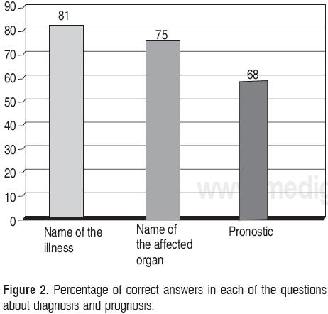 A large percentage of the participants (89%) knew the name of the patient's illness and in most of cases (81%) they were able to refer to it correctly according to the diagnosis that was written down in the medical chart (Fig. 2). When asked what organ was affected by the illness, only 75% of the participants could properly identify the organ. Only 58% of the informants knew with certainty the prognosis of the illness; similarly, only 53% knew the risk of death associated with the illness.