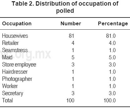 The age of the polled participants varied from 16-77 years (mean: 33.2 years). In 97% of the patients, the patient's mother was polled and only in three cases was the grandmother questioned. The education of the polled relatives was on average 9 years of schooling. Regarding occupation, 81% of the patient's relatives were housewives. The rest of the relatives reported other occupations from housekeepers to commercial activities (Table 2).