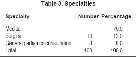 The specialties that managed the patients included in the study were divided into the following: adolescents, cardiology, immunodeficiency clinic, dermatology, endocrinology, gastroenterology, genetics, hematology, Infectious Diseases Clinic, pneumology, surgical specialties (general surgery, cardiovascular surgery, plastic surgery, tumor surgery, neurosurgery, ophthalmology, orthopedics, and urology), and general pediatrics (Table 3). Thirty eight percent of the patients were referred by the genetics service, which is the service that sends most of the patients to the Ambulatory Pediatrics Unit.