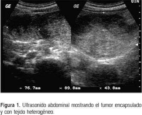 Los exámenes de laboratorio fueron normales, incluidos los niveles de α-feto-proteína y β-gonado-tropina coriónica humana. Se realizó ultrasonido que muestra lesión en cuadrante superior izquierdo, de 8 x 9 x 5 cm aproximadamente, sólido, de aspecto heterogéneo y cápsula bien definida (Fig. 1). Se realiza tomografía axial computarizada (TAC), en la que se observa un tumor de aproximadamente 8 x 8 cm, heterogéneo, bien definido por la presencia de una cápsula (Fig. 2). La imagen por resonancia magnética (IRM) de la lesión en sentido axial (Fig. 3) revela el tumor ocupando gran parte del cuadrante superior izquierdo.