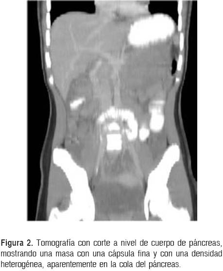 Caso clínico. Se presenta el caso de un paciente femenino de 12 años de edad con la única sintomatología de tumor palpable en epigastrio de crecimiento progresivo. Es diagnosticada con un tumor sólido pseudopapilar localizado en la cola del páncreas y tratada exitosamente con pancreatectomía distal sin esplenectomía. Se egresa a los 3 días de postquirúrgico.