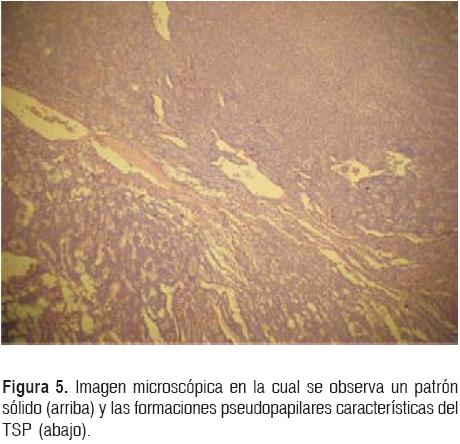 El análisis histopatológico reveló la presencia de un tumor de 9 x 8 x 4 cm, con cápsula color gris blanquecino, indurada. Al corte de la masa se encuentran áreas color café obscuro alternando con áreas sólidas, gris blanquecinas, granulares y áreas microquísticas, con aspecto congestivo hemorrágico (Fig. 5). El diagnóstico histopatológico fue de tumor sólido pseudopapilar del páncreas.