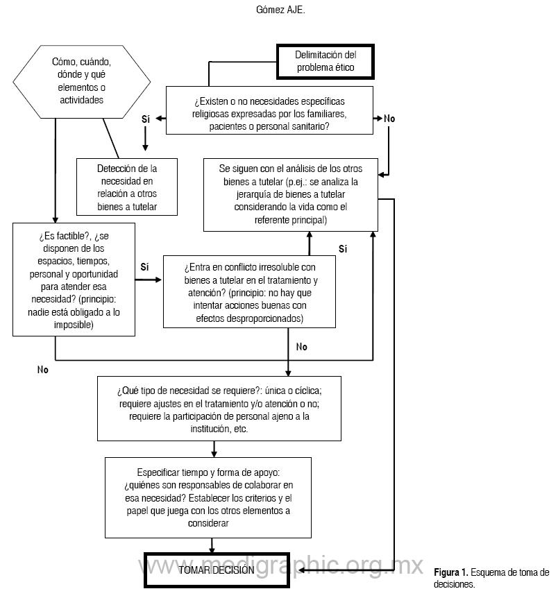Retomando esta idea de religión y pediatría en los dilemas éticos, podríamos considerar hasta qué punto la decisión de los actores involucrados anula o limita la capacidad del florecimiento humano. Así, si un padre o madre se oponen a un tratamiento que abre la posibilidad de expresión del florecimiento humano, en principio uno se debe oponer y buscar alternativas. Se presenta un esquema decisional que puede ser de utilidad (Figura 1).14,15