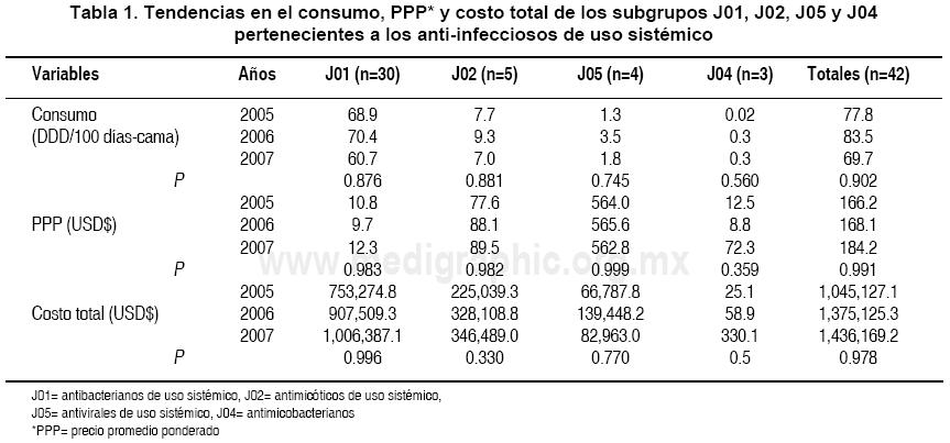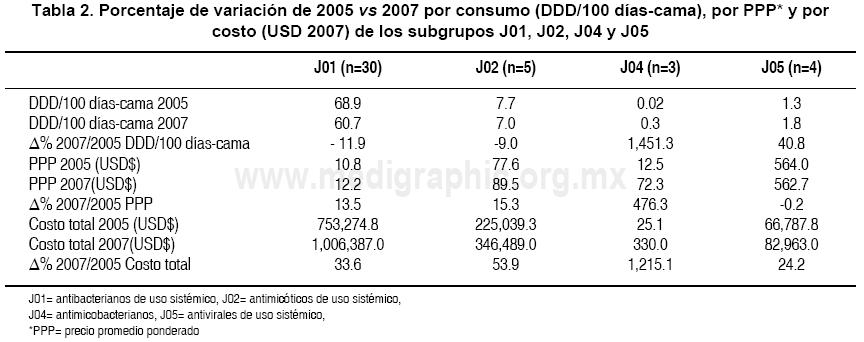 Del total del presupuesto ejercido en medicamentos en el HIMFG, los subgrupos evaluados (J01, J02, J04 y J05) dieron cuenta del 23.4%, 25.8% y 33.1% del gasto para los años 2005, 2006 y 2007, respectivamente. Al transcurrir los años, se descartó que ese incremento porcentual fuera consecuencia de que en el total de los restantes grupos terapéuticos diferentes a los de antiinfecciosos de uso sistémico, hubiera existido un menor consumo, menores PPP o ambos.