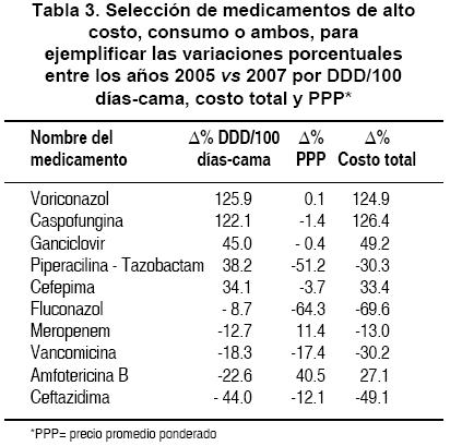 En la Tabla 3 se observa que, entre los años 2005 y 2007, los primeros cinco medicamentos tuvieron una variación porcentual positiva en su consumo y negativa en los restantes. Siete de diez sufrieron una variación negativa en su PPP. Sin embargo, cuando se analizan en el sentido horizontal las tres variables, se puede apreciar que el costo total de cada uno de ellos se vio afectado directamente por el consumo o el PPP, con excepción del meropenem, piperacilina-tazobactam y amfotericina B.