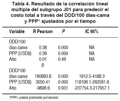 En el análisis a través de regresión lineal múltiple del efecto que pudieran tener el consumo y los PPP sobre el costo total (Tabla 4), se encontró que para el subgrupo J01, tanto en el consumo como el PPP, el efecto fue muy importante ya que el precio explicó hasta el 39% de la variación en el costo total y el consumo hasta el 38%. El cambio por cada unidad de consumo trajo consigo un incremento de USD $190,893.80 y el cambio en una unidad del precio provocó un incremento de USD $3,050.40.