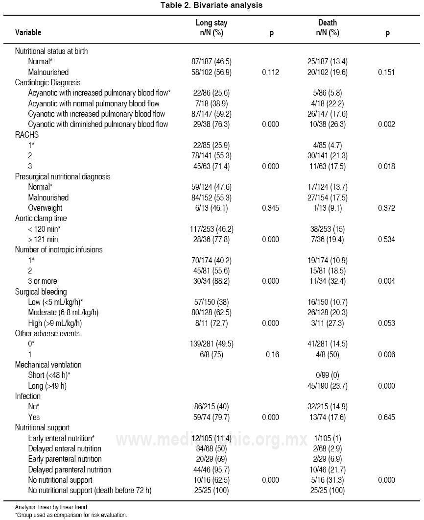 In the multivariate analysis, malnutrition at birth increased the risk for long stay (OR 2.772; 95% CI 1.2825.995; p <0.010), and malnutrition before surgery increased the risk for mortality (OR 3.447; 95% CI 1.00611.812; p <0.049). They were adjusted for every variable involved in the outcome (Tables 3 and 4).