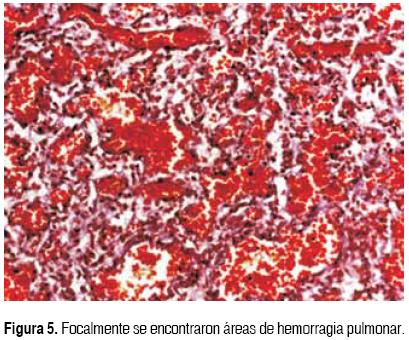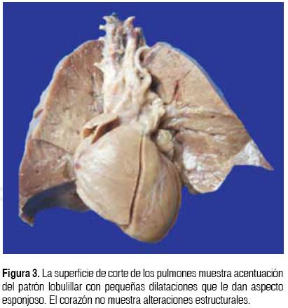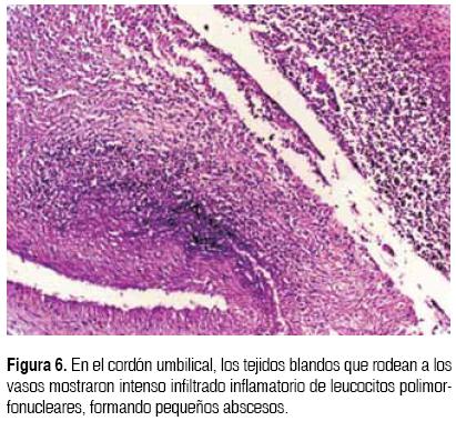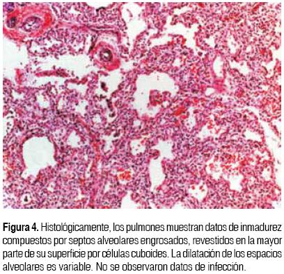 En el estudio postmortem, el paciente pesó 2 200 g para un peso esperado de 3 172 g, con talla adecuada a la edad, de 43.5 cm para un esperado de 44 cm. El aspecto exterior mostró desarrollo armónico con cianosis peri bucal y subungueal. En la extremidad inferior izquierda se observa pie equino varo. En la región lateral derecha del cuello se encontró una herida quirúrgica de 1 cm, asociada a la colocación de catéter venoso central. Se encontró neumotórax bilateral. A la apertura de cavidades hubo 15 cm3 de líquido hemorrágico en la cavidad pericárdica; 15 cm3 de líquido hemorrágico en la cavidad pleural derecha; 10 cm3 de líquido serohemático en la cavidad pleural izquierda y 15 cm3 de líquido xantocrómico en la cavidad peritoneal. En la disección del cuello, se encontró hematoma en los tejidos blandos que se extendió hasta la pleura derecha e izquierda. Los órganos más afectados fueron los pulmones (Figura 3). Las complicaciones de la prematuridad y su tratamiento a nivel pulmonar incluyen la enfermedad de membranas hialinas, la displasia broncopulmonar y el enfisema intersticial, las cuales reflejan una transición poco exitosa de la vida in utero a la vida extrauterina, que requiere el reemplazo del líquido intraalveolar por aire y surfactante, que mantendrán una tensión adecuada en la superficie alveolar. Estas alteraciones pulmonares son las principales causas de morbilidad y mortalidad en el niño prematuro, cuyos pulmones son frecuentemente inmaduros, morfológica y funcionalmente.14-16 En nuestro paciente, la superficie pleural pulmonar presentó acentuación del patrón lobulillar; al corte, la superficie era de aspecto esponjoso, con dilatación de espacios aéreos; la mucosa de la tráquea y de los bronquios principales mostró edema y ulceración focal. Histológicamente, los pulmones presentaron obliteración bronquiolar variable y bronquiolectasias, hiperplasia de neumocitos tipo 2, atelectasias y engrosamiento de la pared vascular a expensas de la media. Focalmente hay hemorragia (Figuras 4 y 5). En el cordón umbilical se observó infiltrado inflamatorio intenso compuesto principalmente por leucocitos polimorfonucleares (Figura 6). En el hígado, congestión sinusoidal, hematopoyesis extramedular y colestasis intracelular leve. En el timo hubo disminución en los elementos de la población linfoide, y presencia de material eosinófilo denso en la luz de los corpúsculos de Hassall. La apertura del tubo digestivo descubrió la presencia de sangre, 20 cm3 en la luz del estómago, duodeno e ileon. La musculatura lisa del estómago, esófago e ileon presentaron bandas de contracción; hubo hemorragia intraparenquimatosa en los testículos y necrosis coagulativa con hemorragia focal en la corteza suprarrenal. La base del cerebro muestra hemorragia subaracnoidea en los lóbulos occipitales y cerebelo (Figura 7).
