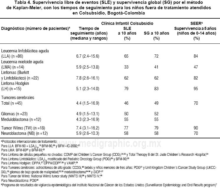 En cuanto a los resultados informados de SG y SLE (Tabla 4), los mejores resultados fueron para SLE (Tabla 4), los mejores resultados fueron para los niños con linfoma Hodgkin, nefroblastoma (Wilms) y LLA. Los elementos de carácter técnico que consideramos relacionados con este resultado favorable fueron el inicio de tratamiento para leucemias y linfomas dentro de las primeras 24 h de su ingreso, y para el tumor de Wilms en el trans-operatorio, como lo recomienda el "National Wilms Tumor Study" (siglas en inglés NWTS).6,38,39 Creemos que también jugó un papel fundamental en los resultados de supervivencia la aplicación, sin demoras ni interrupciones, de protocolos internacionales de quimioterapia mencionados en la Tabla 4.