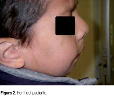En Noviembre del 2003 se detecta masa abdominal durante consulta de seguimiento, sin otra sintomatología. A la exploración física se aprecia micrognatia (Figura 1), nariz en silla de montar, implantación baja de pabellones auriculares (Figura 2), paladar blando hendido (Figura 3), astigmatismo con hiperfunción de músculos oblicuos inferiores, abdomen con aumento del perímetro, con masa palpable en región de hipocondrio derecho y epigastrio, con borde hepático 5-5-4 cm por debajo de parrilla costal, consistencia dura, lisa, no dolorosa que rebasa la línea media, ausencia de testículo izquierdo y hernia inguinal izquierda. El ultrasonido demostró una lesión heterogénea de lóbulo hepático izquierdo. La tomografía de abdomen mostró una lesión de 74.4 x 77.8 mm, heterogénea, bien delimitada, dependiente de hígado lóbulo izquierdo, que refuerza con la aplicación de contraste (Figura 4). La biometría hemática con anemia normocrómica, normocítica (hemoglobina 10.8 g/dL, hematocrito 34%), trombocitosis (622,000 mm3). Las pruebas de función hepática se reportan sin alteraciones, las cifras de α-fetoproteína sérica 52,750 ng/dL y fracción β de hormona gonadotrofina coriónica de cero mUI/mL. La serología para diagnóstico de hepatitis fue la siguiente: anti HAV IgM negativo, HBsAg negativo, anti HBS positivo. Se realizó biopsia hepática reportando HB mixto (epitelial y mesenquimatoso).