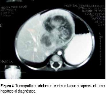 Los estudios para detección de metástasis fueron negativos. Se inició manejo con protocolo institucional con tres fármacos: vincristina (1.5 mgm2sc), cisplatino (90 mgm2sc) y 5-fluorouracilo (1 gm2sc). Posterior a tres ciclos, se realizó lobectomía hepática izquierda y se consolidó con dos ciclos adyuvantes de mismo esquema de quimioterapia, para un total de cinco ciclos.