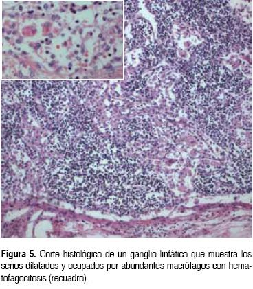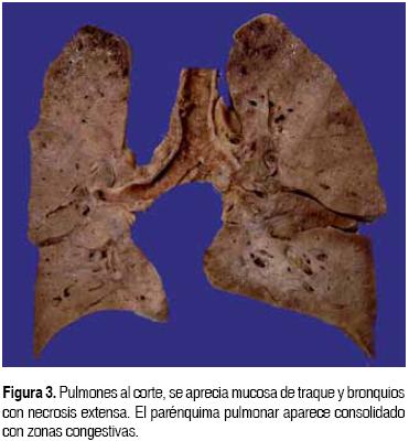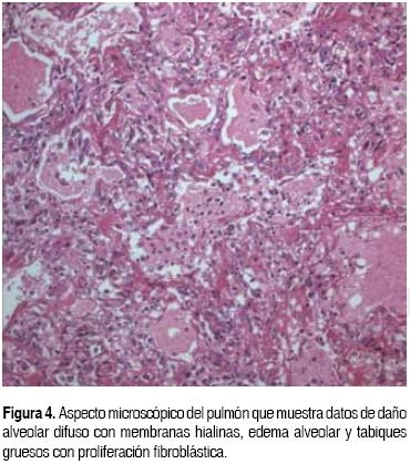 Dr. Guillermo Ramón García (Médico adscrito Departamento de Patología). Al momento de la autopsia, el paciente aún presentaba lesiones dérmicas en la cara como son el eritema facial alrededor de las mejillas y alrededor de los ojos. Se tomó un fragmento de piel que muestra en la dermis, alrededor de los vasos, leve infiltrado inflamatorio linfohistiocitario perivascular (Figura 1). Se tomaron también músculos en diversos sitios que mostraron fibras atróficas, pequeñas, anguladas, situadas a la periferia de los fascículos. No se encontró inflamación o necrosis en ninguno de los músculos muestreados (Figura 2). La combinación de la lesión inflamatoria en dermis con la atrofia perifascicular en los músculos apoyan el diagnóstico de dermatomiositis.5 Como se puede desprender del análisis de la historia clínica, las complicaciones más importantes en este paciente estuvieron en el aparato respiratorio. En esta imagen se muestran los pulmones al corte, cuya mucosa de tráquea y bronquios presenta necrosis extensa. Los ganglios peritraqueales y peribronquiales están aumentados de tamaño (Figura 3). Los pulmones tienen aspecto sólido en múltiples áreas alternando con zonas hemorrágicas. Se encontró neumotórax residual en el lado derecho. Microscópicamente se corrobora la necrosis extensa en toda la mucosa de las vías aéreas que se extiende a toda la pared. El parénquima pulmonar muestra alveolos ocupados por edema, fibrina, membranas hialinas que corresponden a daño alveolar difuso agudo, y zonas de necrosis e inflamación aguda múltiples que corresponden a áreas con neumonía de focos múltiples (Figura 4). Los ganglios linfáticos muestran hiperplasia de senos con numerosos histiocitos con hemofagocitosis (Figura 5). Esta hemofagocitosis también fue observada en la médula ósea, hígado y bazo. El hígado estaba congestivo, aumentado de peso y, microscópicamente, presentaba esteatosis difusa de gota gruesa. En el páncreas había esteatone-crosis y leve infiltrado inflamatorio. Los riñones estaban congestivos y aumentados de peso; microscópicamente se observó, en los túmulos, edema acentuado de su epitelio con cambios de degeneración hidrópica. En el encéfalo se encontró hemorragia subaracnoidea focal sobre los hemisferios a nivel de los lóbulos occipitales, acompañado de edema y congestión; al corte se aprecian pequeños infartos sobre la región occipital y frontal.