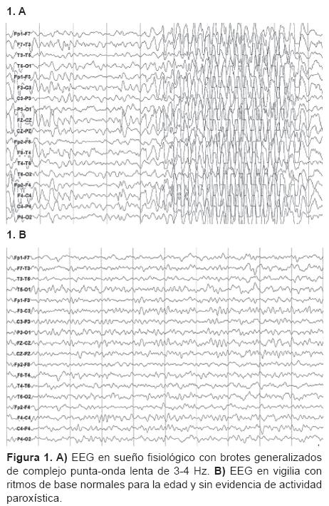 Se trata de un paciente femenino de 5 años producto de segunda gestación con curso normal y periodo neonatal sin complicaciones. Padres jóvenes no consanguíneos, sin antecedentes familiares de epilepsia. Su desarrollo tanto psicomotor como del lenguaje fueron normales hasta los 2 años de edad, cuando sus padres observaron falta de respuesta a órdenes sencillas e indiferencia a estímulos externos. Posteriormente mostró pérdida del lenguaje espontáneo (sólo emitía ecolalias) por lo que a los 3 años de edad inició con terapia del lenguaje durante un año, sin mejoría. Se descartó pérdida auditiva mediante la realización de potenciales evocados de tallo cerebral, por lo que fue remitida a evaluación neurológica, en la que se descartaron movimientos anormales, conductas ritualistas, estereotipias o pérdida del contacto visual en el interrogatorio. Se encontraron abundantes ecolalias, obediencia de órdenes sencillas de forma ocasional y lenta, contacto visual adecuado pero indiferente al medio y no se apreciaron movimientos estereotipados. Neurológicamente no cumplió con los criterios del DSM-IV para el diagnóstico de autismo. Se le realizaron EEG en reposo, en vigilia y en sueño no-REM; durante este último se observaron brotes intermitentes de ondas agudas y complejos punta-onda lenta de 3-4 Hz generalizadas durante el sueño (Figura 1A). Durante la vigilia no se observó actividad paroxística (Figura 1B). La tomografía axial computarizada simple y la contrastada, de cráneo, fueron normales.