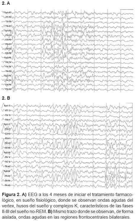 En este caso, las anormalidades electroencefalográficas en el sueño, consistentes en complejos punta onda-lenta de 3-4 Hz, fueron clave para establecer el diagnóstico. Esta anormalidad es considerada por diversos autores como una característica mayor del síndrome, que debe observarse en 85% del registro en el sueño no-REM.3,9-11 Aunque no fue posible realizar un estudio polisomnográfico y la paciente permaneció en vigilia la mayor parte durante el EEG inicial, las manifestaciones clínicas y las anormalidades electroencefalográficas fueron suficientes para fundamentar el diagnóstico.