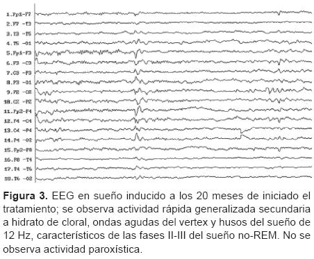 A los 20 meses de tratamiento se realizó EEG de control en sueño inducido con hidrato de cloral en el que no se observó actividad paroxística (Figura 3). En 24 meses de tratamiento con VPA, FNR y terapia de lenguaje, no se refirieron cambios conductuales ni otros eventos adversos; se incrementó considerablemente la cantidad de lenguaje espontáneo y, hasta su más reciente evaluación, no ha presentado crisis convulsivas.