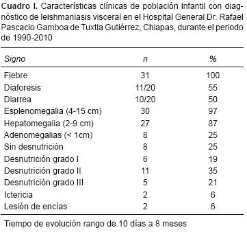 Methods. This was a retrospective descriptive study. We reviewed the clinical files and epidemiological reports from the Department of Pediatrics of the Hospital General Dr. Rafael Pascacio Gamboa of Tuxtla Gutiérrez, Chiapas. All patients with a diagnosis of visceral leishmaniasis confirmed by serology, indirect immunofluorescence and the presence of amastigotes in the bone marrow aspirate were included. Epidemiological and clinical data were collected.