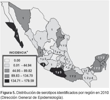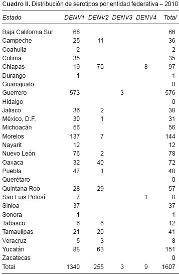 La distribución por entidad federativa en 2010 demostró que los estados de Guerrero, Morelos, Yucatán y Nuevo León presentaron un mayor número de detecciones para DENV1. En Querétaro, Zacatecas, Guanajuato y Durango no se logró identificar el o los serotipos circulantes. Chiapas sigue siendo el estado en el que se identificaron tres serotipos circulantes, los mismos que en 2009. Se logró identificar también la circulación de DENV3 en Guerrero y, en San Luis Potosí, se identificaron DENV1 y DENV4. La circulación de DENV1 y DENV2 se identificó en 14 estados y en nueve estados únicamente se identificó DENV1 (Cuadro II). Los estados de Colima y Guerrero presentaron la incidencia más alta observada (Figura 5).
