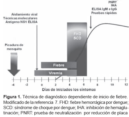 Las técnicas de laboratorio para la detección de infecciones por el virus de dengue se determinan dependiendo del tiempo de iniciada la fiebre (Figura 1). El DENV tiene un periodo de incubación de tres a siete días (antes de que se presente la fiebre) y continúa circulando en la sangre hasta cinco días después de iniciada la fiebre. Durante este periodo (fase aguda) el virus y el antígeno viral pueden ser detectados en el suero. Después del sexto día de iniciada la fiebre se pueden detectar los anticuerpos IgM como diagnóstico de infección actual y, para el día 14, se pueden detectar los anticuerpos IgG. En reinfecciones por serotipos diferentes se observa una respuesta inmune anamnésica, en la cual la viremia es más corta y los anticuerpos IgM se detectan en un periodo más corto y en concentraciones menores; la concentración de los anticuerpos IgG se incrementa en la fase aguda de la enfermedad. Durante esta fase aguda se emplean métodos virológicos para determinar el serotipo viral, como el aislamiento viral en células de mosquitos [C6/36 (A. albopictus), AP61 (A. pseudoscutellaris)] y en células de mamífero [Vero (riñón de mono verde), BHK21 (riñón de hámster)], además de los métodos de biología molecular como la RTPCR en punto final y en tiempo real.7 Las altas concentraciones de antígeno viral NS1 durante la fase aguda de la enfermedad permiten determinar mediante métodos inmunoenzimáticos (ELISA) las infecciones por DENV, más no identificar el serotipo infectante.8,9