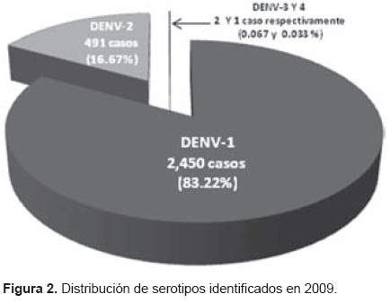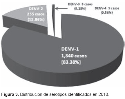 En 2009 se analizaron un total de 6,336 muestras de suero; se identificó el serotipo viral en 2,944 de ellas. El DENV1 se identificó en mayor proporción seguido del DENV2 y, finalmente, en la misma proporción DENV3 y DENV4 (Figura 2). En 2010 se analizaron un total de 2,013 muestras de suero; se identificó el serotipo responsable de la infección en 1,607 muestras. La distribución de serotipos 1, 2 y 3 se presentó en la misma proporción que en 2009. La identificación de DENV4 se incrementó, detectándose en 9 muestras (Figura 3).