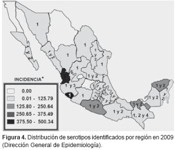 La distribución de serotipos por entidad federativa en 2009 demostró que los estados de Jalisco, que tuvo un grupo significativo, Michoacán, Colima y San Luis Potosí presentaron un mayor número de identificaciones para DENV1. El estado en el que no se logró identificar el serotipo circulante fue Guanajuato. El estado en el que se logró identificar la circulación de tres serotipos fue Chiapas, con DENV1, DENV2 y DENV4. En Jalisco se identificaron DENV1 y DENV3. En 15 estados se identificó DENV1 y DENV2 y en 10 estados únicamente se identificó la circulación de DENV1 (Cuadro I). El estado de Colima presentó la incidencia más alta: 727.38 por cada 100 000 habitantes (Figura 4).