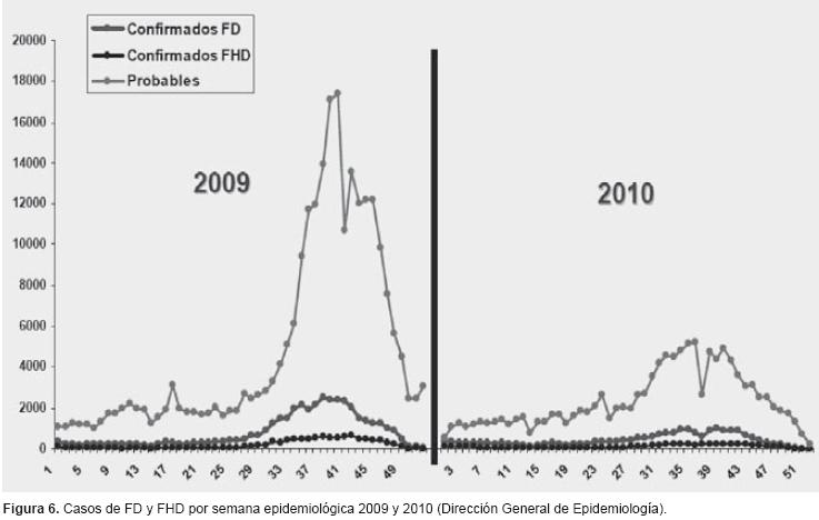 El dengue es una prioridad de salud pública en México; en 2009 se reportaron al sistema de vigilancia epidemiológica de dengue casi un cuarto de millón de casos probables y en 2010 se tuvieron 127,840 casos probables: una disminución con respecto al año anterior (Figura 6). En los 2 años analizados se observa que el aumento de los casos es a partir de la semana epidemiológica 31 y disminuyendo en la semana 45. Los casos probables cumplen con la sintomatología compatible para dengue pero no se les tomó una muestra para la confirmación en el laboratorio debido a que está establecido, en los lineamientos de vigilancia epidemiológica, el porcentaje de toma de muestras en zonas con alta o baja transmisión. En los estados con presencia de brotes está establecida la toma a tres de cada diez casos probables; en ausencia de brotes o de baja transmisión está establecido el 100% en la toma de muestras.15