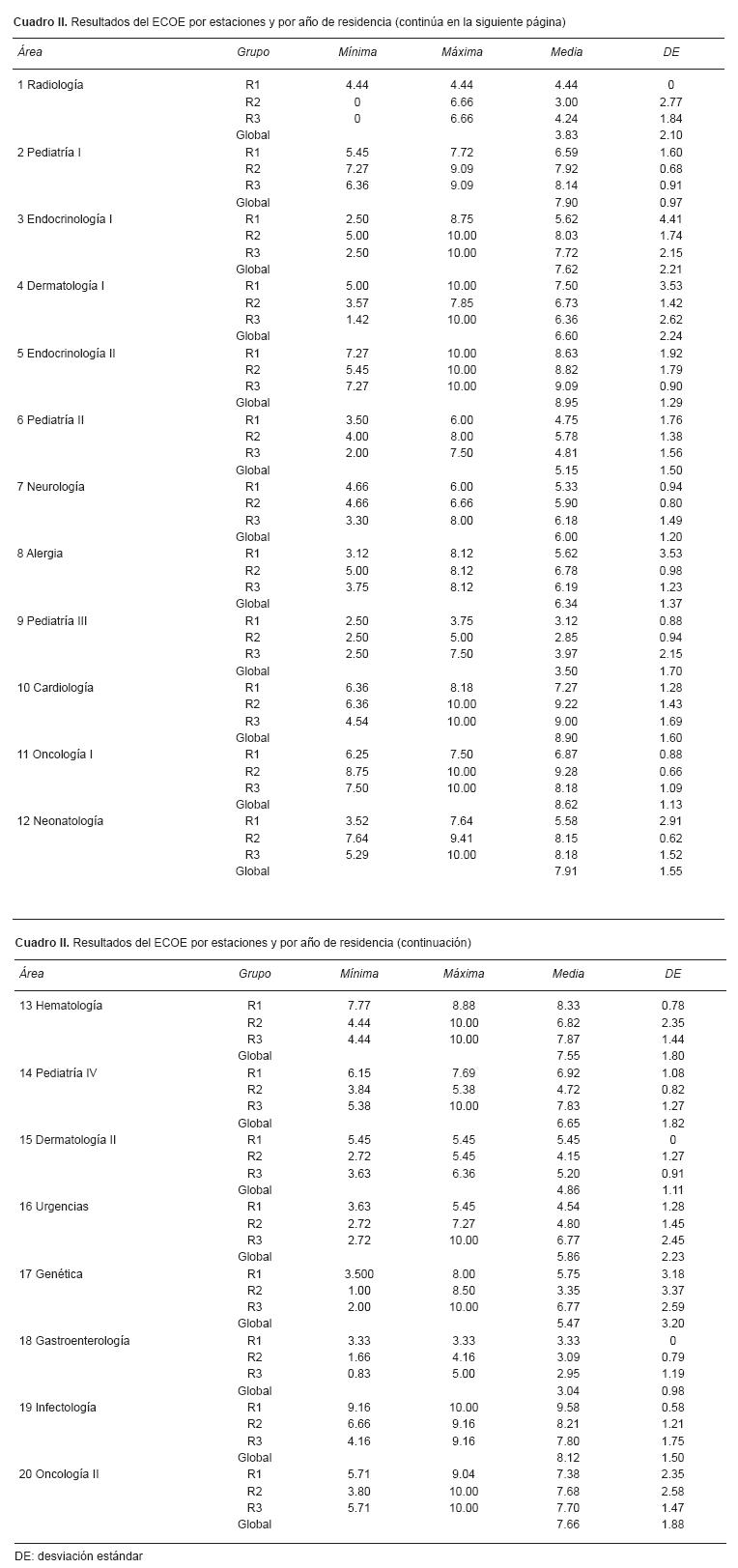 Conclusiones. El ECOE es un método válido y confiable que permite evaluar la competencia clínica de manera integral. La experiencia de su uso en programas de posgrado ha sido limitada; sin embargo, el presente estudio muestra que es una herramienta factible que puede resultar de gran valor tanto para los pediatras en formación como para sus profesores.