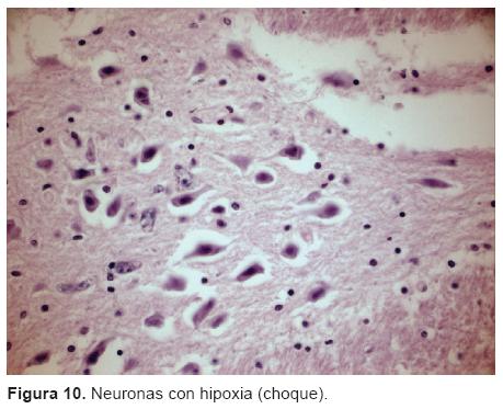 En el sistema nervioso central el encéfalo tuvo un peso de 980 g (esperado de 1059 g); tenía congestión por la convexidad y, microscópicamente, datos de hipoxia neuronal. Todos estos hallazgos secundarios al choque (Figura 10).