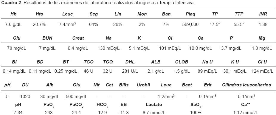 A la exploración física se encontró con palidez tegumentaria, cráneo normocéfalo, fontanela anterior de 2 x 2 cm, normotensa, ojos con pupilas mióticas y con pobre respuesta a la luz, movimientos oculares conjugados, pabellones auriculares bien implantados con salida de material purulento del oído derecho. Cavidad oral adecuadamente hidratada. Se intubó con un tubo endotraqueal #4 fijo en 12 cm. Precordio sin alteración, campos pulmonares bien ventilados bilateralmente. Abdomen blando, depresible, borde hepático a 2 cm por debajo de borde costal derecho, con ruidos peristálticos presentes. Genitales de acuerdo a edad y sexo, extremidades íntegras con pulsos presentes y edema en ambas manos. Sedado por efecto de las benzodiacepinas, pares craneales no valorables, trofismo conservado, fuerza no valorable, reflejos músculo tendinosos no evocables. Se realizaron los exámenes de laboratorio (Cuadro 2).