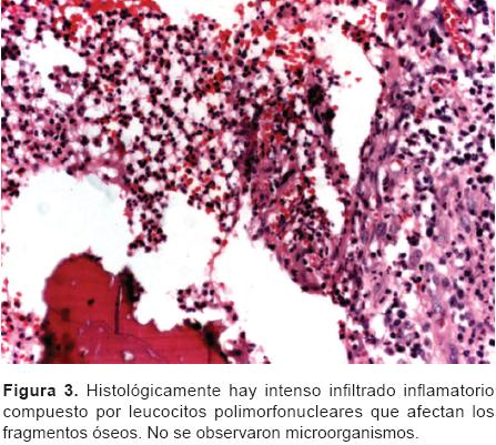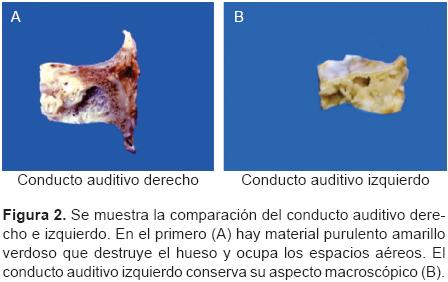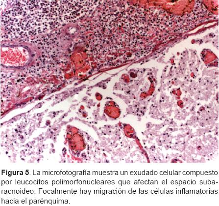 El estudio post mórtem incluyó el análisis de las cavidades y de los conductos de la porción petrosa del hueso temporal con los conductos auditivos derecho e izquierdo. El conducto auditivo derecho mostró destrucción de los elementos óseos con salida de material purulento amarillo verdoso (Figura 2). Los gérmenes más frecuentemente involucrados son el Streptococcus pneumoniae, el Streptococcus pyogenes y el Staphylococcus aureus aunque, en algunos casos, no se aísla germen.13 Las complicaciones descritas en estos pacientes incluyen el absceso subperióstico, el absceso de Bezold, la parálisis facial, la laberintitis supurativa, meningitis, absceso epidural y subdural, absceso cerebral y trombofebitis del seno lateral.14 El estudio microscópico muestra intenso infiltrado infamatorio de leucocitos polimorfo nucleares que ocupan los espacios entre espículas óseas, destruyéndolas focalmente (Figura 3). El encéfalo pesó 700 g (para un peso esperado de 650 g), la superficie externa es opaca, despulida, con material purulento gris amarillento más aparente en los lóbulos frontales y parietales. Los vasos están dilatados, tortuosos y congestivos (Figura 4). Las causas de meningitis con foco infeccioso fuera del sistema nervioso central son por diseminación o por vía hematógena. Histológicamente hay intenso infltrado infamatorio de leucocitos polimorfonucleares en el espacio subaracnoideo, que afecta incluso los plexos coroides (Figura 5). Los núcleos centrales muestran neuronas con el citoplasma con cambios fucsinofílicos y retracción nuclear por hipoxia.