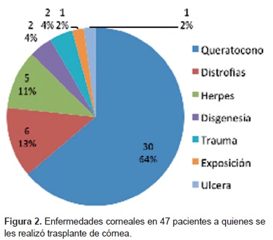 El trasplante corneal se indicó para los casos de enfermedades degenerativas, como el queratocono; por alteraciones corneales congénitas, como la distrofia endotelial congénita hereditaria; por malformaciones congénitas del segmento anterior, por cicatrices ocasionadas por trauma ocular o por infecciones corneales, como la queratitis herpética. Todos los pacientes presentaron una AV ≤ 20/63 previa al trasplante.