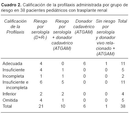 De los 81 pacientes estudiados, 38 requirieron tratamiento profiláctico (21 por serología negativa, 10 por serología y donador cadavérico, 6 por donador cadavérico y 1 por tratamiento con ATGAM). Dos pacientes recibieron profilaxis sin requerirla, ya que eran de bajo riesgo. En 11 de 38 (29%) pacientes la profilaxis fue adecuada, en 5 (13%) fue insuficiente, en 2 (5%) incompleta, en 11 (29%) insuficiente e incompleta, en 4 de 38 (11%) fue inferior y en 5 pacientes (13 %) se omitió la profilaxis (Cuadro 2).