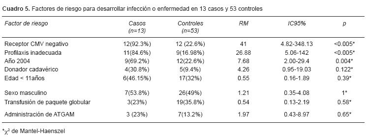 Los factores de riesgo analizados para infección o enfermedad por CMV fueron: edad menor de 11 años, receptor de alto riesgo (D+R-), injerto de donador cadavérico, transfusión de paquete globular durante el trasplante, recomendación de profilaxis farmacológica inadecuada contra CMV (profilaxis omitida o inferior o incompleta o insuficiente o incompleta e insuficiente) y trasplante realizado durante el 2004.