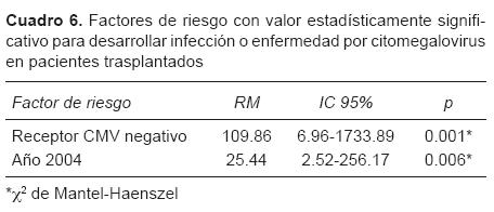 El análisis multivariado se realizó con análisis de regresión logística en modelo saturado, incluyéndose a todas las variables independientes descritas en el análisis bivariado. Las únicas variables que se encontraron independientemente asociadas al desarrollo de infección fueron el estado seronegativo para CMV del receptor antes del trasplante, así como la realización del trasplante durante el año 2004.