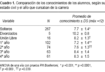 El 30.3% tuvo conocimientos suficientes; el 69.3%, regulares y el 0.3%, deficientes. Entre hombres y mujeres no existió diferencia significativa. Al comparar los conocimientos por grupos de edad, se encontraron diferencias significativas inversamente proporcionales entre los menores de 19 y mayores de 20 años ( t = -5.217, gl = 298, p = 0.0001), siendo mayores en los que tenían más de 20 años. Al comparar por estado civil, hubo diferencias ( F = 5.462, gl = 3 y p = 0.001). Los grupos que las marcaron fueron los solteros versus los divorciados y los que vivían en unión libre versus los divorciados. De igual manera, los conocimientos fueron diferentes, según el año que cursaban ( F = 12.079; gl = 3 y p = 0.0001). Las diferencias se presentaron entre quienes cursaban el 1° año versus 3° y 4° año y el 2° versus 3° y 4° año, respectivamente (Cuadro 1).