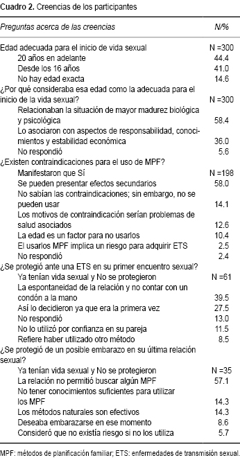 Al explorar la variable de creencias, la mayoría consideró que la edad adecuada de inicio de vida sexual era de los 20 años en adelante y que esta edad se relacionaba con una situación de mayor madurez biológica y psicológica. Con respecto al uso de anticonceptivos, más de la mitad reconocieron que pueden presentarse efectos secundarios, aunque hubo una proporción menor cuyas respuestas reflejaban falta de información. Al preguntar acerca de las ETS, 4 de cada 10 estudiantes no se protegieron de una ETS en su primer encuentro sexual, debido a la espontaneidad o bien a la decisión consciente de no hacerlo. En el mismo sentido ocurrió la decisión de utilizar algún método de planificación familiar en la última relación sexual. La mayoría no lo utilizó, 1 de cada 10 refirió que no tenía los conocimientos suficientes para utilizarlos y 5% consideró que no existía riesgo si no los utilizaba (Cuadro 2).