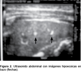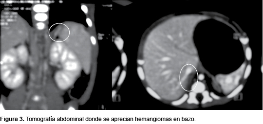 Durante su estancia en el HIMFG, el paciente presentó caída progresiva de la hemoglobina (8.6 mg/dL) y plaquetas (79,000 mm3), requiriendo transfusión de concentrado eritrocitario. Debido a que presentaba más de cinco hemangiomas cutáneos, se procedió a realizar estudios de gabinete para búsqueda de lesiones viscerales. Se realizó un ultrasonido abdominal que reportó imágenes hipoecoicas en bazo (Figura 2). El ultrasonido transfontanelar resultó normal. La tomografía axial computarizada (TAC) de tórax y abdomen reportó imágenes en bazo (Figura 3) y en pulmones sugerentes de hemangiomas (Figura 4). La resonancia magnética de cráneo resultó normal.