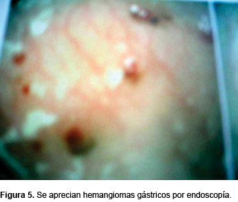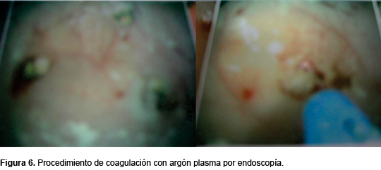Por la persistencia del sangrado se decidió intentar la coagulación con argón plasma. Se lograron coagular aproximadamente 15 hemangiomas localizados en fondo, cuerpo y antro, sin complicaciones (Figura 6).