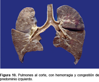 Los pulmones tuvieron un peso de 650 g contra un esperado de 253 g, macroscópicamente con algunas áreas de congestión y hemorragia de predominio en el pulmón izquierdo (Figura 10). Microscópicamente, se observó hemorragia y edema intraalveolar (Figura 11).