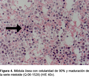 La primera biopsia que se recibió en el hospital es la Q-2006-1528, en la cual se observaron fragmentos de hueso trabecular sin alteraciones y varios espacios intertrabeculares con celularidad aproximada de 90%. Las tres series hematopoyéticas están presentes. La serie mieloide madura normalmente hasta bandas y segmentados. La serie eritroide es escasa y los megacariocitos no muestran alteraciones. No hay células neoplásicas ni mielofibrosis (Figura 4).