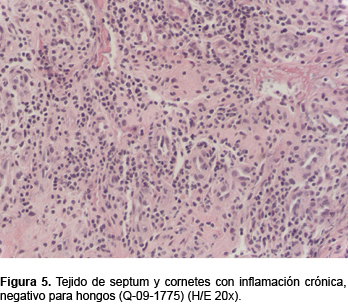 En 2009 se recibió otra biopsia (Q-09-1775) que correspondía a tejido identificado como mucosa de septum y cornetes con necrosis isquémica, trombosis e inflamación crónica. No se observaron hongos ni otros microorganismos (Figura 5).