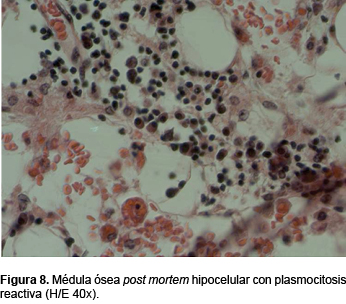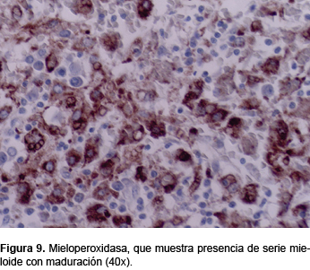 Posteriormente, se recibió, en el Departamento de Patología, el cuerpo de una niña con una facies normal, con una herida reciente suturada con grapas de 20 cm de longitud, localizada en la línea media abdominal y los orificios de los estomas. La médula ósea mostró una celularidad disminuida en relación a las biopsias previas, de aproximadamente 50% (Figura 8). Las tres series estaban disminuidas; sin embargo, continuó la maduración de la serie mieloide. Hay, además, numerosas células plasmáticas y macrófagos de citoplasma claro. Se realizaron tinciones de inmunohistoquímica. La mieloperoxidasa mostró la presencia de serie mieloide y su maduración (Figura 9). La tinción de CD138 evidenció la presencia de células plasmáticas aumentadas en número.
