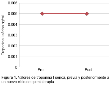 Se realizó la medición de troponina I sérica en todos los pacientes ingresados al estudio. El promedio fue de 0.005 ng/ml. La segunda medición de troponina I, obtenida en las primeras 24 horas posquimioterapia, prácticamente no sufrió variaciones. El valor promedio de estos resultados fue también de aproximadamente 0.005 ng/ml (Figura 1).