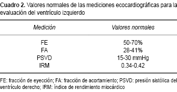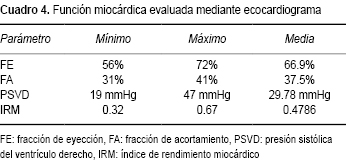 Para la evaluación de la función miocárdica se utilizó el ecocardiograma transtorácico bidimensional, modo M, Doppler tisular y espectral (con el ecocardiógrafo IE33 Marca Phillips de cuatro cámaras), en los ejes paraesternal largo y apical. Se evaluó la función sistólica del ventrículo izquierdo mediante la fracción de eyección, la fracción de acortamiento, y el índice de rendimiento miocárdico (IRM), así como la presión sistólica del ventrículo derecho (Cuadro 2).