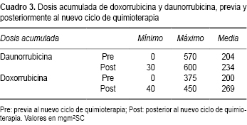Se muestran los valores de las dosis acumuladas de antracilinas al inicio del estudio y posterior al nuevo ciclo de tratamiento (Cuadro 3). La media para daunorrubicina fue de 204 mgm2SC antes y 234 mgm2SC después del nuevo ciclo de quimioterapia. La media para doxorrubicina fue de 200 mgm2SC y 269 mgm2SC, respectivamente.
