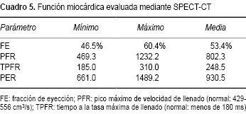 Los resultados de la valoración de la función cardiaca obtenidos por ecocardiograma y SPECT-CT se muestran en los Cuadros 4 y 5, respectivamente.