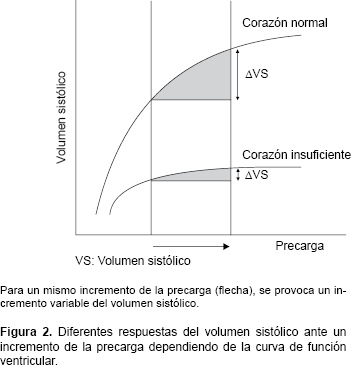 No obstante, se debe recordar que el aumento del VS como resultado de una prueba de fluido depende no solamente del incremento en la precarga, sino también de la función ventricular y la poscarga ventricular, ya que la reducción de la contractilidad disminuye el grado de la pendiente de la relación entre la precarga y el VS (curva de Frank-Starling) (Figura 2).19