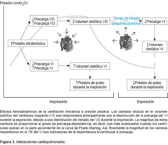 Un importante número de estudios han demostrado que la variación del volumen sistólico (VVS) (derivado del análisis de contorno de pulso), la variación de la presión de pulso (VPP) (derivado del análisis de la onda arterial) y la variación de la amplitud de la onda pletismográfica de la oximetría de pulso son medidas altamente predictivas de respuesta a fluidos.29 Esto se fundamenta en la interacción cardiopulmonar durante el uso de la ventilación mecánica, donde la ventilación a presión positiva intermitente induce cambios cíclicos biventriculares. El principal mecanismo ocurre en el VD durante la inspiración, donde el aumento de la presión intratorácica provoca una disminución de la precarga al dificultar el retorno venoso por la disminución de la gradiente entre la presión sistémica media y la presión auricular y, al mismo tiempo, aumenta la postcarga en relación al incremento inspiratorio de la presión transpulmonar (PTP). Esto, finalmente, determina una caída del volumen eyectivo (VE) del VD (el cual es mínimo al final del periodo inspiratorio). Por otro parte, el volumen sanguíneo contenido a nivel pulmonar es ''estrujado'' hacia el VI aumentando su precarga y su VE durante la inspiración. Luego de un intervalo de dos o tres latidos (tiempo de transito sanguíneo pulmonar) se observa un descenso del llenado del VI. Así, la caída de la precarga del VI induce un descenso de su volumen eyectivo, el cual es mínimo durante el periodo espiratorio (Figura 3).