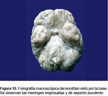 El encéfalo pesó 1,500 g contra un esperado de 1,450 g. Llamó la atención, visto por la convexidad, el aspecto de las meninges. Estas se observaron opacas, despulidas, y se observó el orificio de la ventriculostomía. Visto por la base, las meninges se encontraron muy engrosadas, es decir, afectada toda la porción infratentorial. Presentó una meningitis fibrinopurulenta que es evidente desde el punto de vista macroscópico (Figura 10). Se realizaron cortes axiales, donde se evidenció que este paciente tenía un daño cerebral muy extenso de predominio en el hemisferio derecho, afectando frontal, temporal y ganglios de la base. Había extensas áreas de infarto y de necrosis que afectaron todo el mesencéfalo, puente y parte de los hemisferios cerebrales (Figura 11).