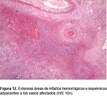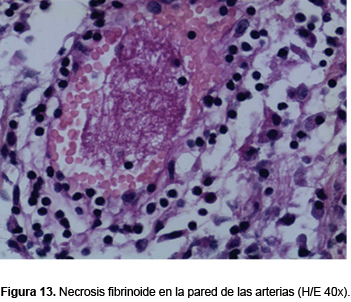 La lesión histológica se caracterizó por una vasculitis granulomatosa necrosante que afecta arteriolas y arterias de pequeño y mediano calibre. Estaba constituida por granulomas con numerosos linfocitos e histiocitos epitelioides que afectan toda la pared de los vasos sanguíneos. Además, hay pérdida por necrosis. Este infiltrado se extiende a las áreas perivasculares. En las zonas cercanas hay extensas áreas de hemorragia, necrosis, infartos hemorrágicos e isquémicos (Figura 12). En los vasos más afectados es evidente la vasculitis que presentaba este paciente. Se observa una vasculitis de larga evolución con lesiones en varias etapas de evolución. Se pueden ver lesiones plexiformes, nuevamente el infiltrado y la necrosis. A mayor aumento, la presencia de necrosis y numerosos histiocitos epitelioides que conforman los granulomas. Esta es una lesión histológica muy representativa de una vasculitis necrosante granulomatosa, donde podemos ver pérdida de la elástica interna y de la elástica externa por necrosis fibrinoide, además del infiltrado inflamatorio. En una tinción de PAS, que tiñe membranas basales, se puede observar la presencia de lesiones plexiformes y necrosis fibrinoide. Había otras arterias y arteriolas mucho más afectadas (Figura 13). Se realizaron tinciones para la búsqueda de microorganismos, especialmente hongos y micobacterias. Existen cinco causas de granulomas: micobacterias, hongos, enfermedades reumatológicas, reacciones a cuerpo extraño y sarcoidosis. De este grupo, las únicas que pueden dar granulomas con vasculitis son las causas reumatológicas. Estas son arterias y arteriolas de mayor calibre que podemos ver no están afectadas, el infiltrado inflamatorio es perivascular, la pared está íntegra.